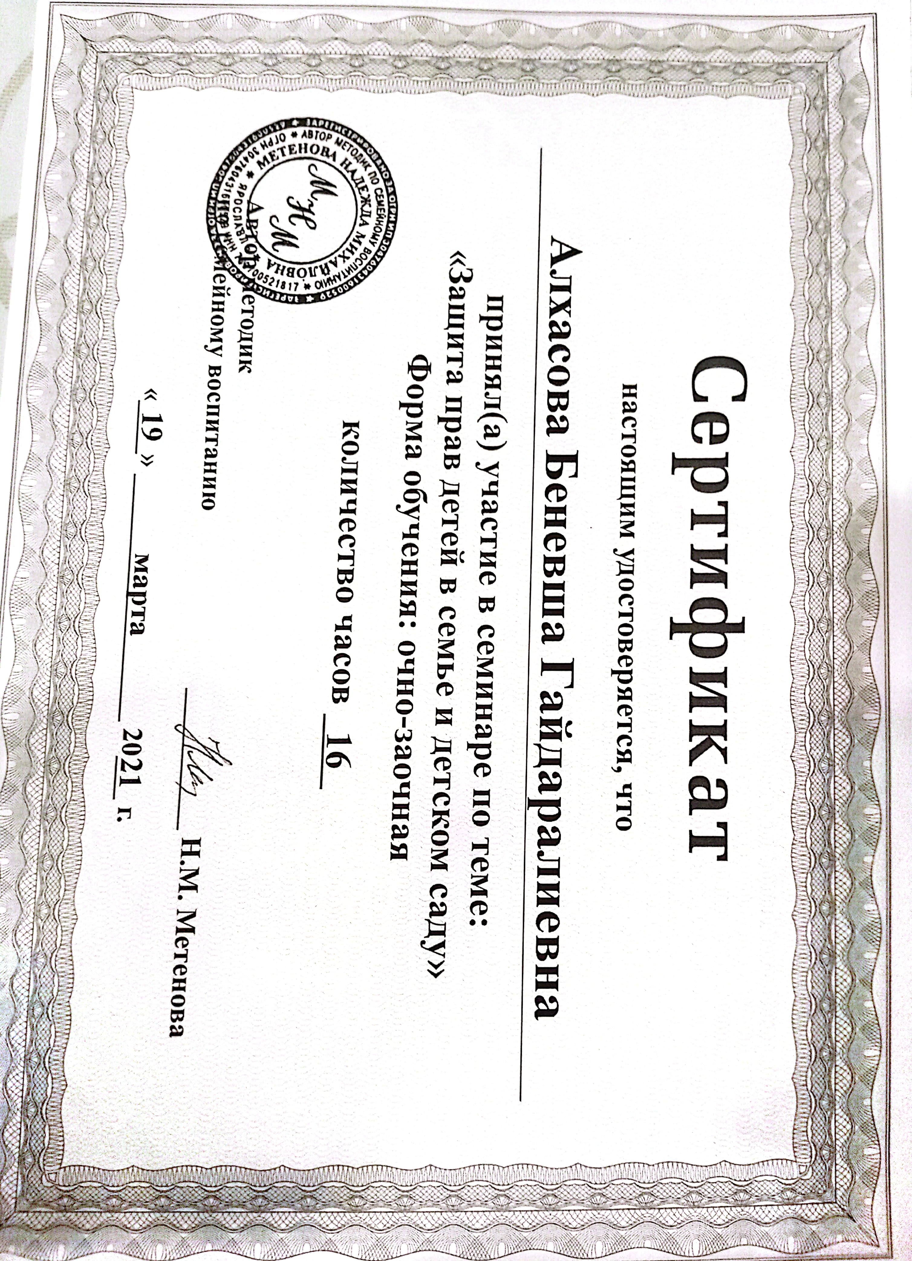 Сертификат о прохождении курсов "Защита прав детей в семье и детском саду"