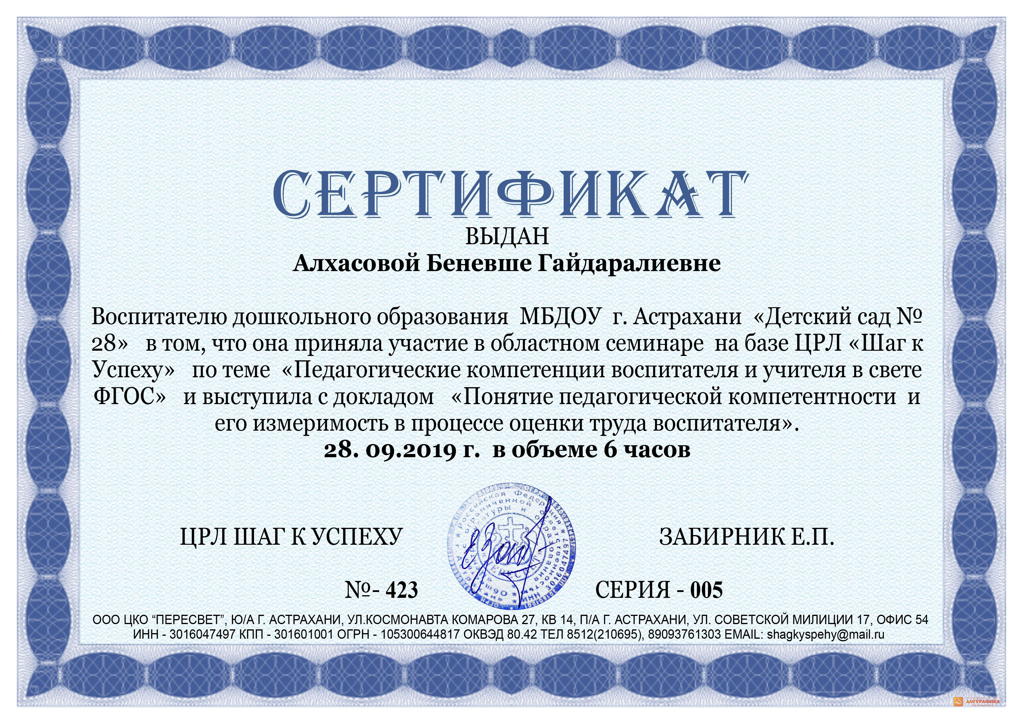 Сертификат об участии в областном семинаре на базе ЦРЛ "Шаг к успеху"