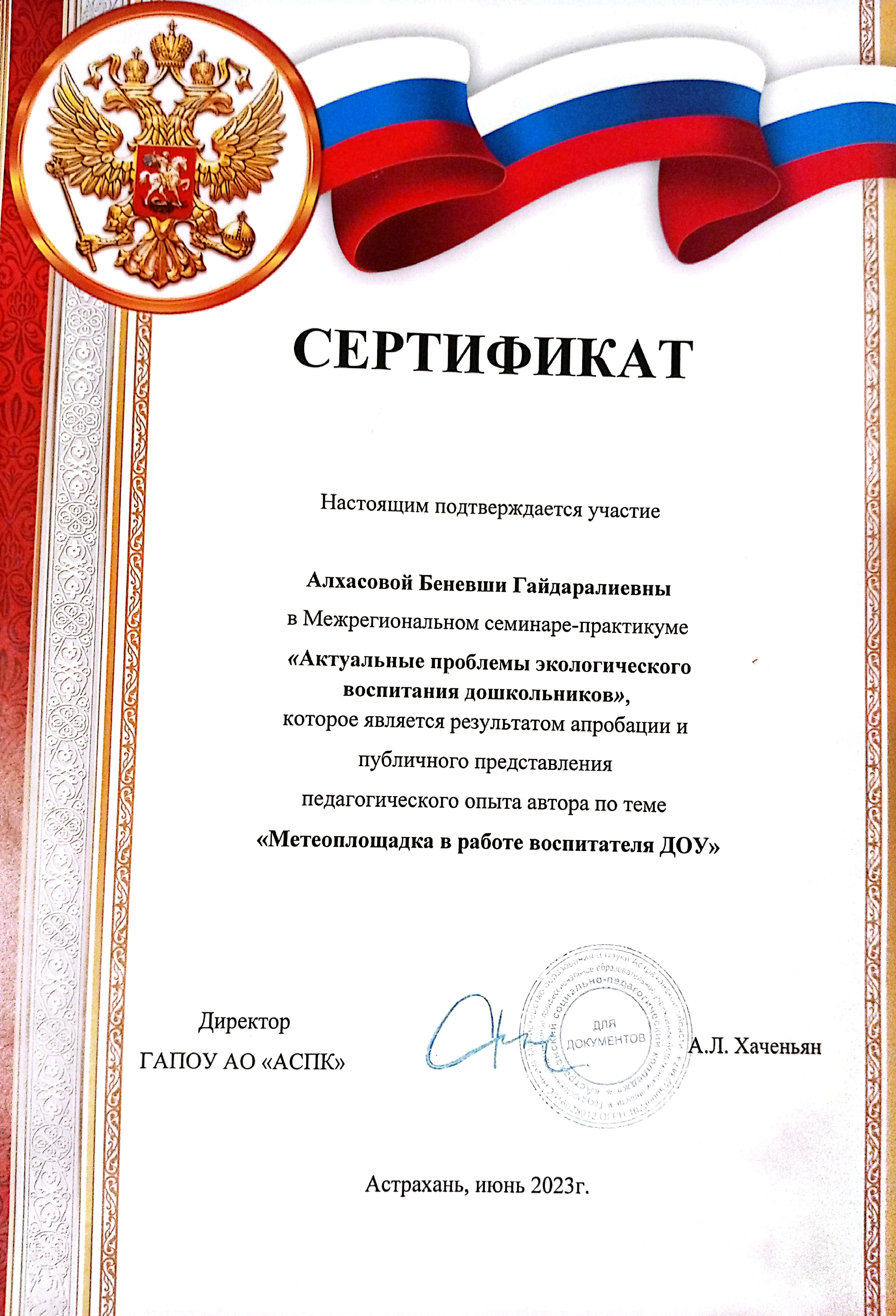 Сертификат об участии в Межрегиональном семинаре-практикуме "Актуальные проблемы экологического воспитания дошкольников"