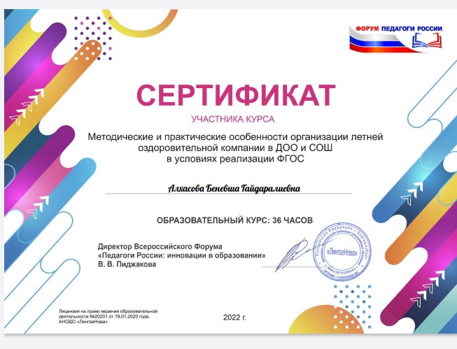 Сертификат о прохождении курсовой подготовки "Методические и практические особенности организации летней оздоровительной кампании"